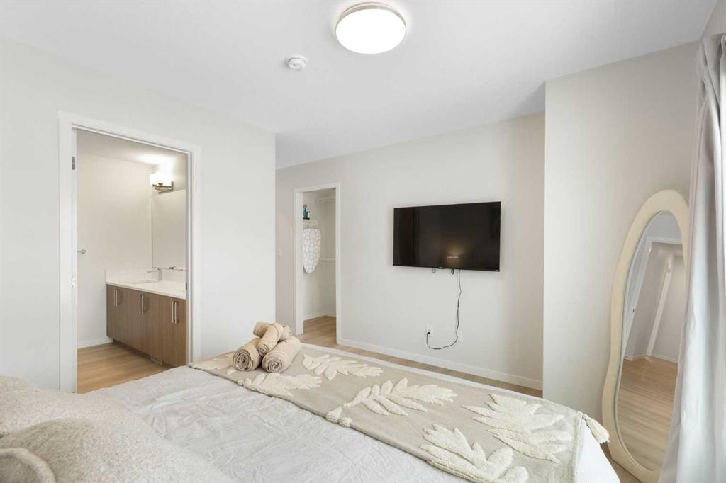 SETON SERENITY, one of Calgary’s most sought-after developments, built by CedarGlen Living—winner of the CustomerInsight Builder of Choice Award for 5 consecutive years. Welcome to this spacious 1,711 sq.ft. RMS (1,805 sq.ft. builder size) 3-bedroom, 2.5-bath townhome featuring an open-concept layout, 9' ceilings, and LVP flooring throughout the main living level. Perfectly positioned directly facing the pond, this home offers beautiful open views right at your doorstep, creating a peaceful and premium living environment. The south-facing exposure fills the home with abundant natural light throughout the day, making it bright, warm, and energy-efficient—helping reduce utility costs year-round. The kitchen is thoughtfully designed with full-height cabinetry, quartz countertops, subway tile backsplash, undermount sink, and stainless steel appliances. The oversized island flows seamlessly into the spacious living and dining areas—ideal for everyday living and entertaining. The primary bedroom features a generous walk-in closet, quartz countertops, dual sinks, and a stand-up shower. Additional bedrooms are perfect for family, guests, or a home office. The upper level also includes convenient laundry (washer & dryer included) and a 4-piece bathroom with quartz counters and a tub/shower combo. A double side-by-side garage keeps your vehicles secure and protected in all seasons. Enjoy exceptional amenities just steps away, including the world’s largest YMCA, Seton HOA, South Health Campus, shopping, restaurants, and cafes. Pet-friendly complex. Move-in ready with immediate possession available. Virtual tour available.